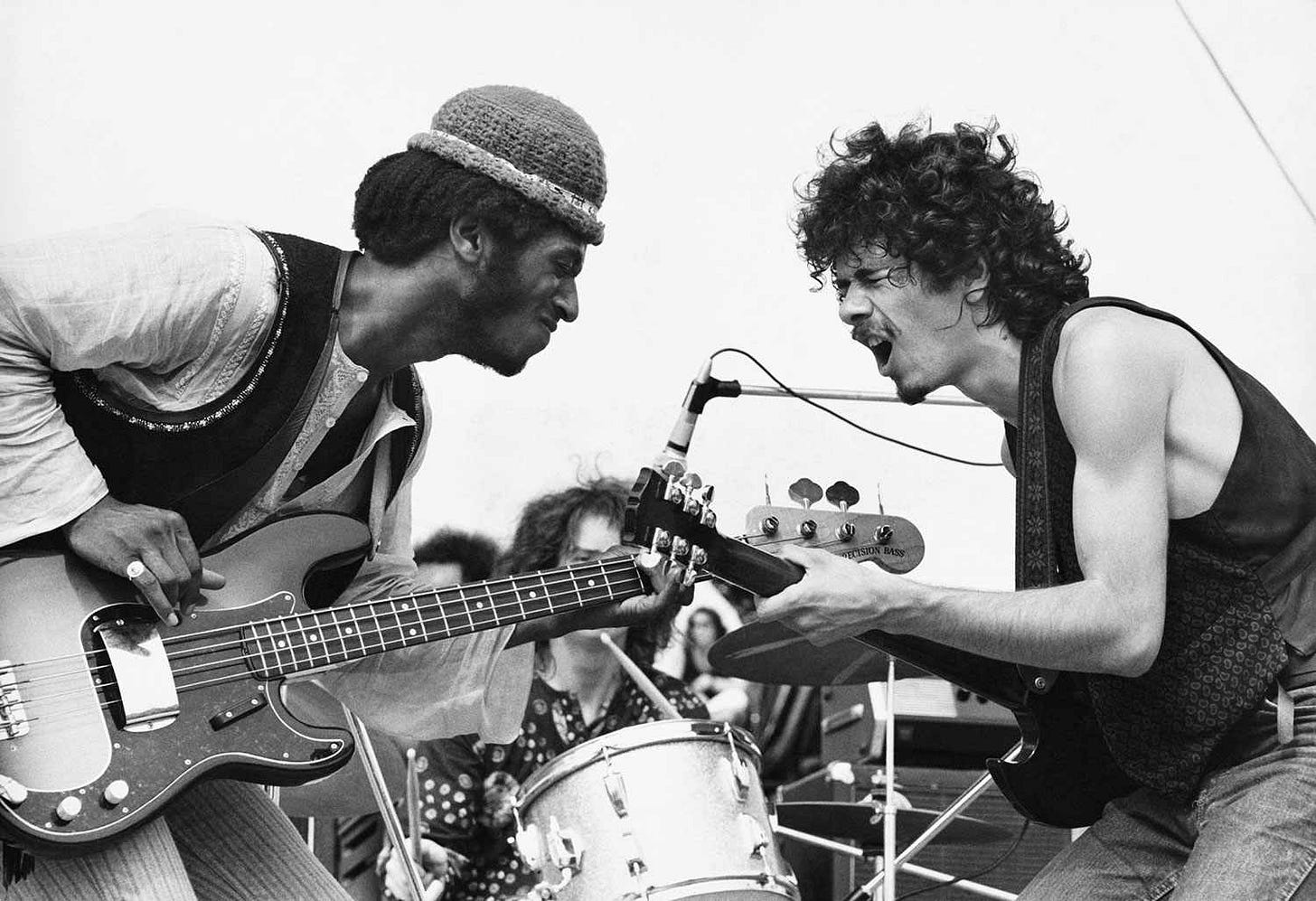 The song was “Soul Sacrifice,” an instrumental performed at high velocity by an ethnically mixed group of young men, in lockstep. Led by Carlos Santana on lead guitar, he was supported by a wall of percussion provided by Michael Shrieve (twenty years old at the time), José “Chepito” Areas, and Michael Carabello. The song would appear on their debut album, Santana, released just weeks after their August 1969 performance at Woodstock. Rounding out the band were keyboardist Gregg Rolie and bassist David Brown.